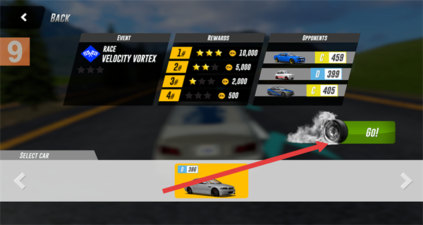 4、在比赛准备界面确认好车辆后,点击GO!按钮,即可正式开始赛车比赛。