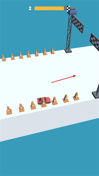 3、继续操控红色赛车穿过锥形桶围成的路径,朝着终点方向持续推进行驶进程。