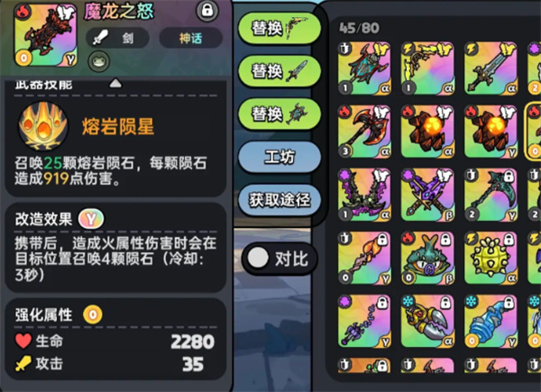 火系输出核心:召唤25颗熔岩陨石,每颗造成919点伤害,范围覆盖广,伤害高,是火系最强输出武器,适合所有火属性伤害角色。