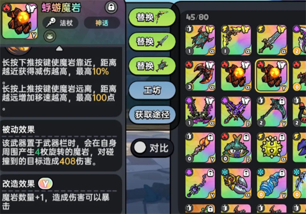 多面手特性:适用于不同战斗场景,长按下推按键魔岩靠近获得减伤,长按上推按键魔岩远离提升移速,被动生成4枚旋转魔岩持续输出