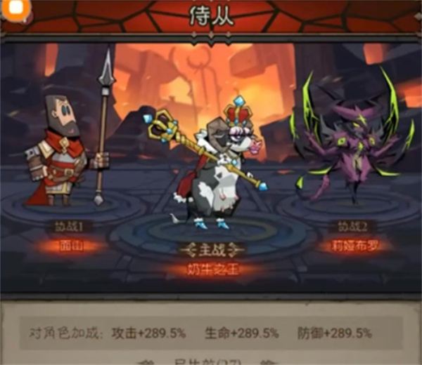 2、侍从系统:侍从分主战(如“面团”“莉娅布罗”)、主成(“奶牛之王”),提供攻击、生命、防御加成(+289.5%),侍从养成(等级、星级)可解锁更多增益。