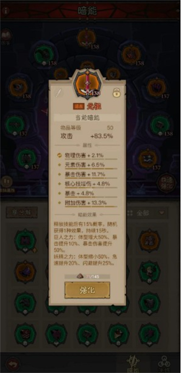 2、暗能装备选择元祖武器提供闪避加成,铁血兽魂项链强化生存,通过装备属性叠加,配合技能效果将闪避率提升至70%,大幅增强战场生存能力。