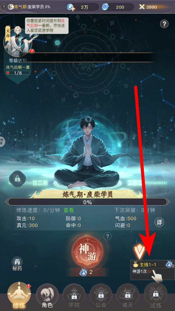 3、修炼主线衔接进入修炼界面后,新手关注右下角主线提示主线,跟随指引完成任务,同时可利用神游功能加速修炼进程,提升角色等级。