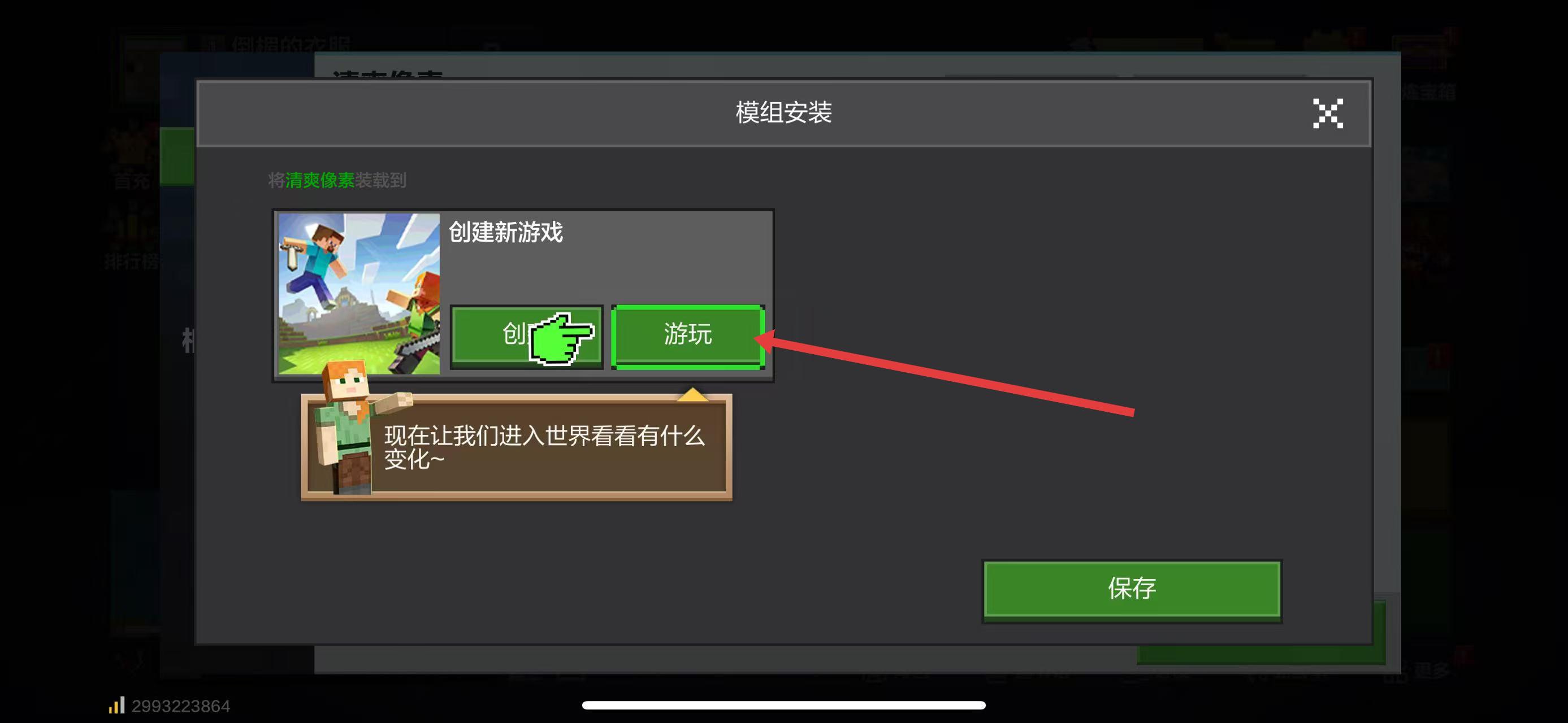 3、下载结束,在模组安装界面,选择游玩,进入加载该模组的游戏世界体验新材质。