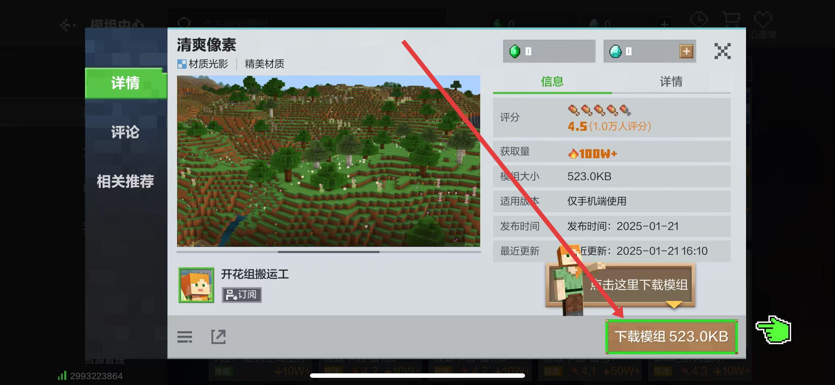 1、进入“清爽像素”模组详情页,点击右下角免费按钮,获取该材质模组。