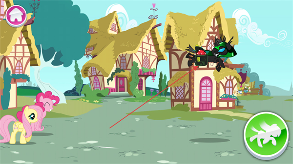 1、操控小马在小镇中奔跑,躲避黑色反派的追击,利用地形周旋。