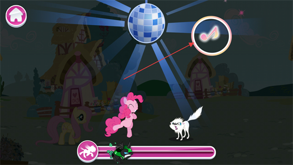 3、在迪斯科场景中,点击音符图标,完成互动,对抗反派。