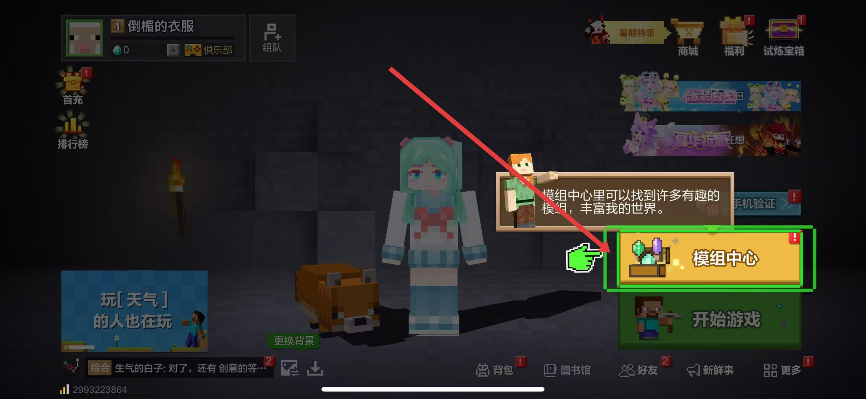 1、在游戏主界面右侧,找到标有模组中心的黄色按钮并点击,这里能获取各类丰富模组,助力拓展游戏玩法。
