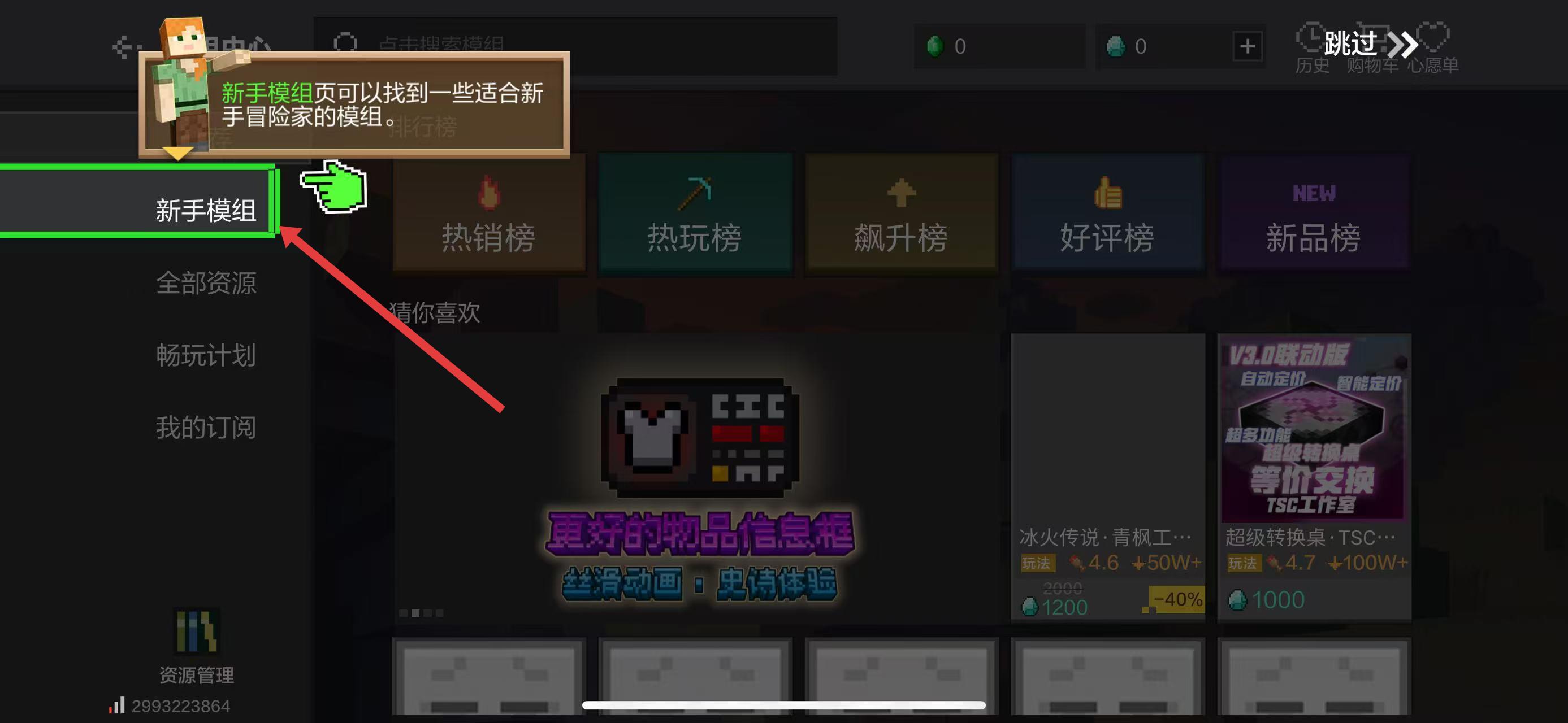 2、进入模组中心后,在左侧导航栏点击新手模组,该板块专为新手准备,可找到适配新手的趣味模组资源。