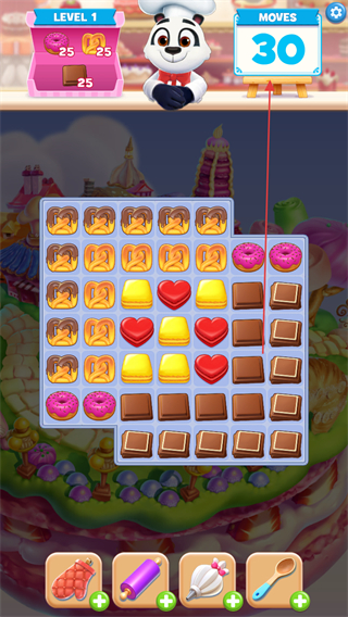 1、查看LEVEL1目标需收集物品,注意MOVES30步数限制,准备消除对应饼干。