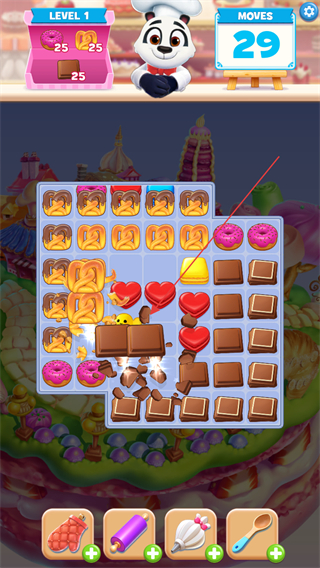 2、拖动相同图案饼干连成线,触发消除,MOVES减为29,获取对应道具。