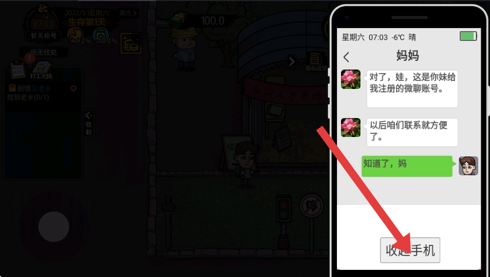 3、处理与妈妈的微聊对话,及时收起手机,回归游戏的场景,继续探索和完成任务,保持了游戏进程的连贯性。