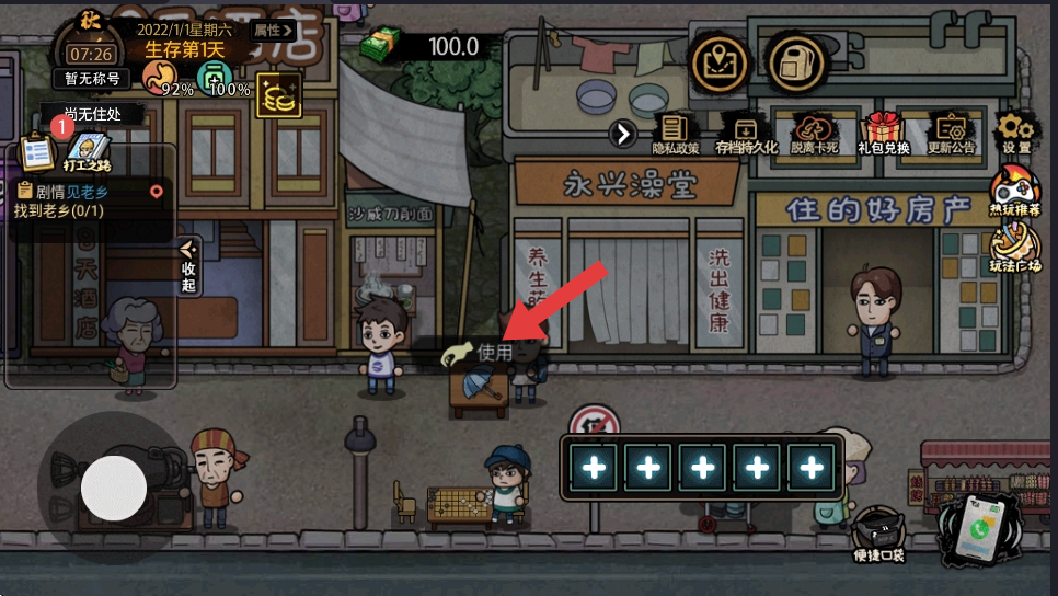 4、在场景中使用道具如伞,与NPC互动,解锁新的功能或剧情,同时利用周围的店铺如澡堂、房产中介获取资源。
