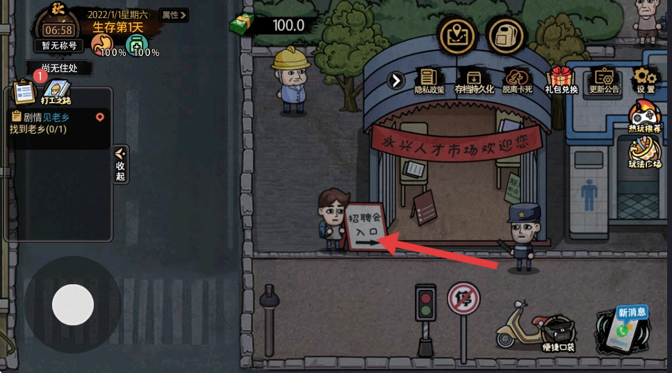 2、前往人才市场的招聘会入口,参与招聘活动,获取工作机会,积累资金初始100.0,为生存和发展奠定基础。