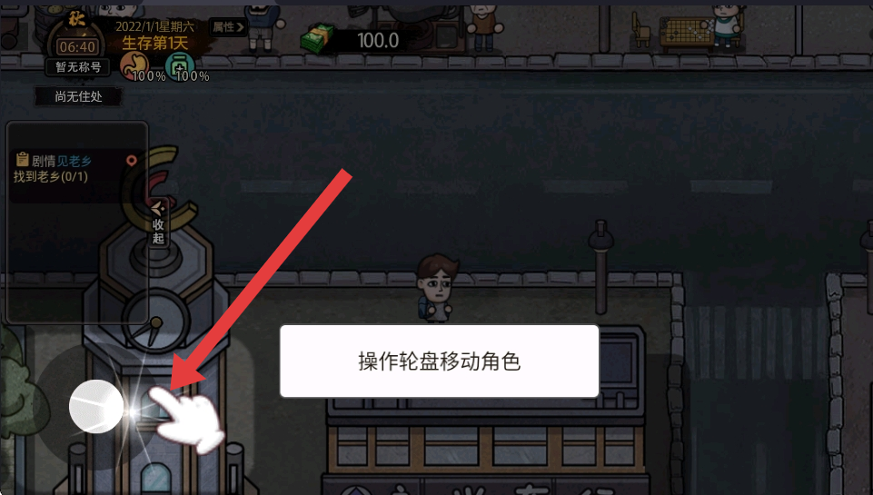 1、通过左侧轮盘操控角色移动,在城市场景中探索,完成剧情见老乡任务,寻找老乡推进剧情,留意互动元素。
