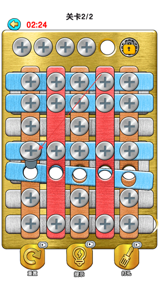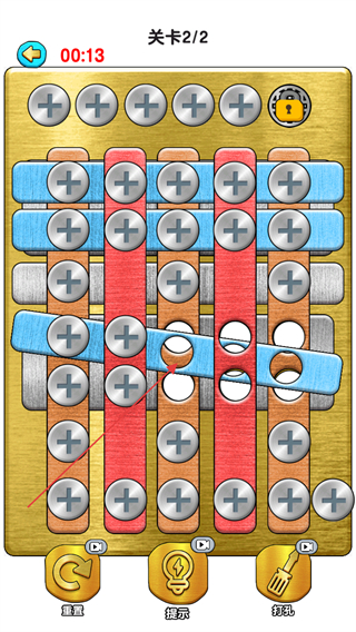 1、在关卡2/2中,拖动锤子移动带孔板块,对齐红色区域的孔洞,推进解谜。