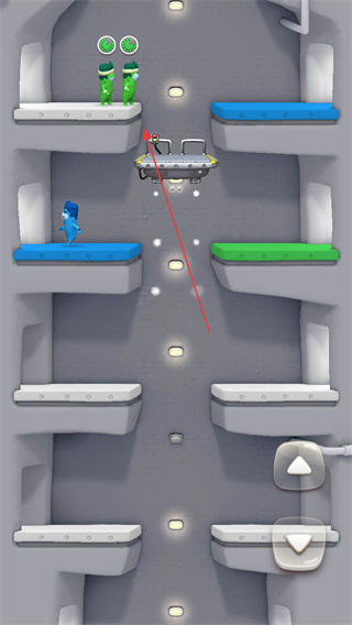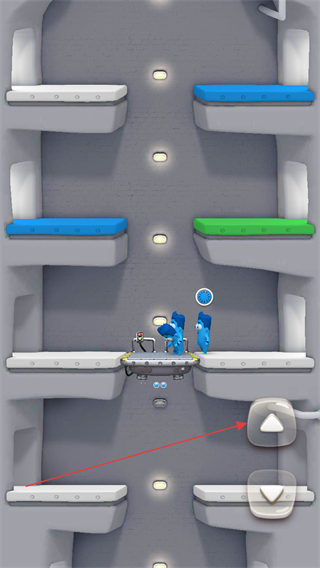 3、操控电梯升降,将绿色小人送达对应楼层平台,完成该角色的运送任务。