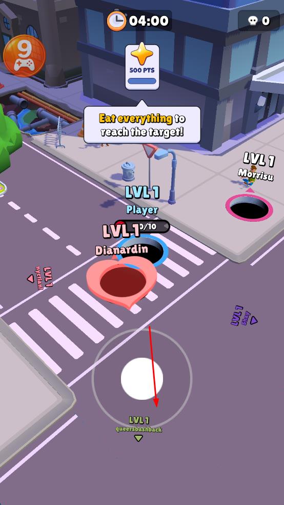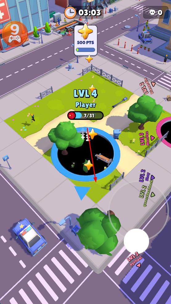 1、打开黑洞大作战游戏,进入游戏后,操控黑洞在城市街道移动,吞噬周围的物体,不断扩大黑洞的等级,从LVL1开始逐步提升。