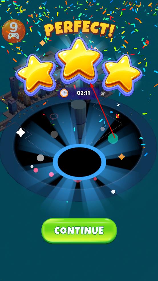4、在规定时间内,尽可能多地吞噬物体,提升黑洞等级和积分,争取获得三星评价,完成关卡后,点击继续,进入下一关挑战。