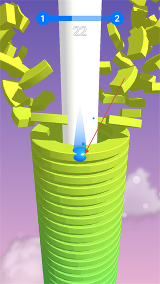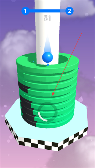3、继续让小球下落,击碎绿色堆栈层,接近终点平台。