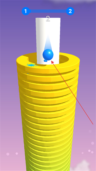 1、控制蓝色小球下落,击碎黄色堆栈层,积累得分。