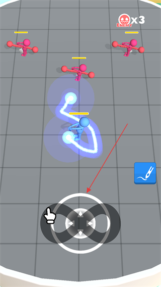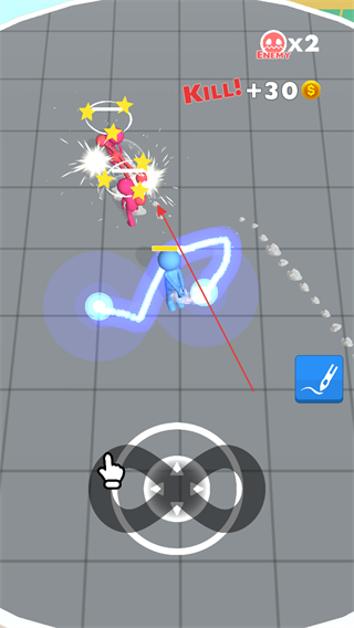 1、通过下方摇杆操控蓝色角色移动,利用绘制的激光剑武器,在战场中走位,躲避粉色敌人攻击,同时寻找进攻时机。