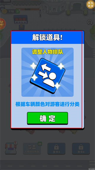 3、重复选择对应颜色车辆并移动至车位的操作,接送完所有出现的旅客,直至界面显示关卡完成的提示。