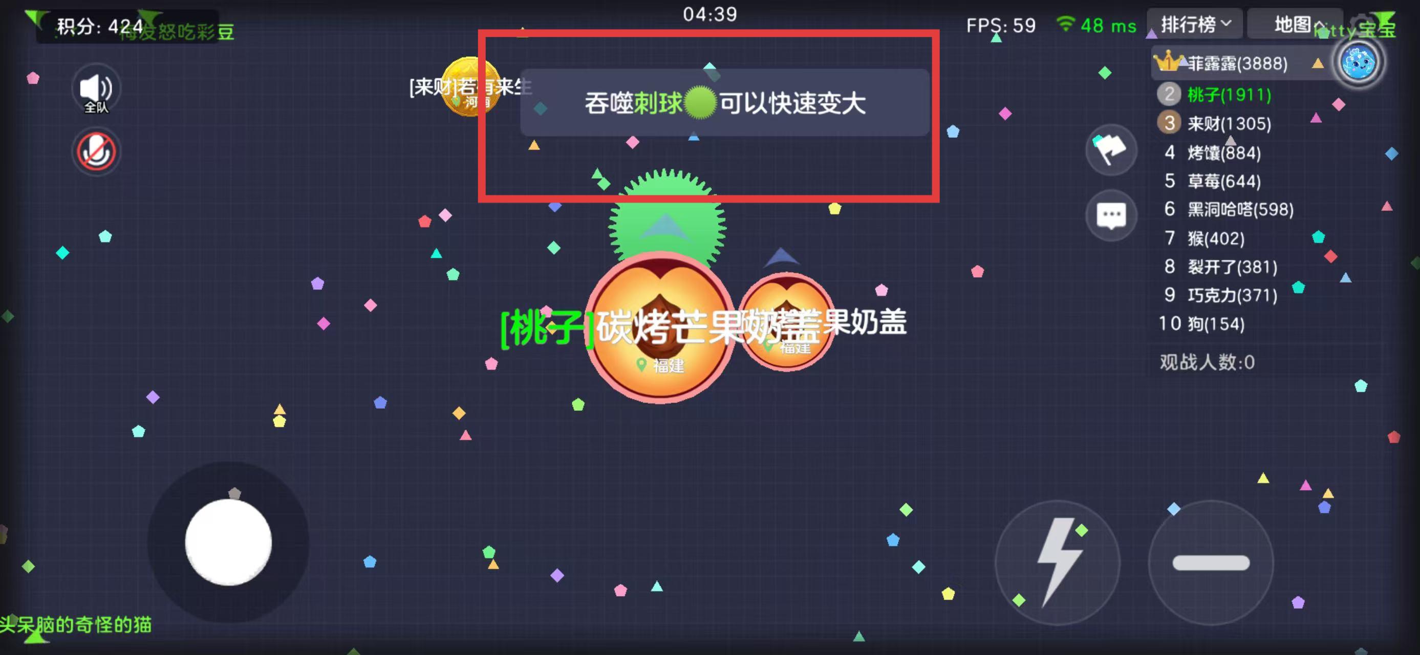 3、当球球体积足够,寻找绿色刺球,吞噬后能快速增加体积,助力在对战中占据优势,持续壮大自己。