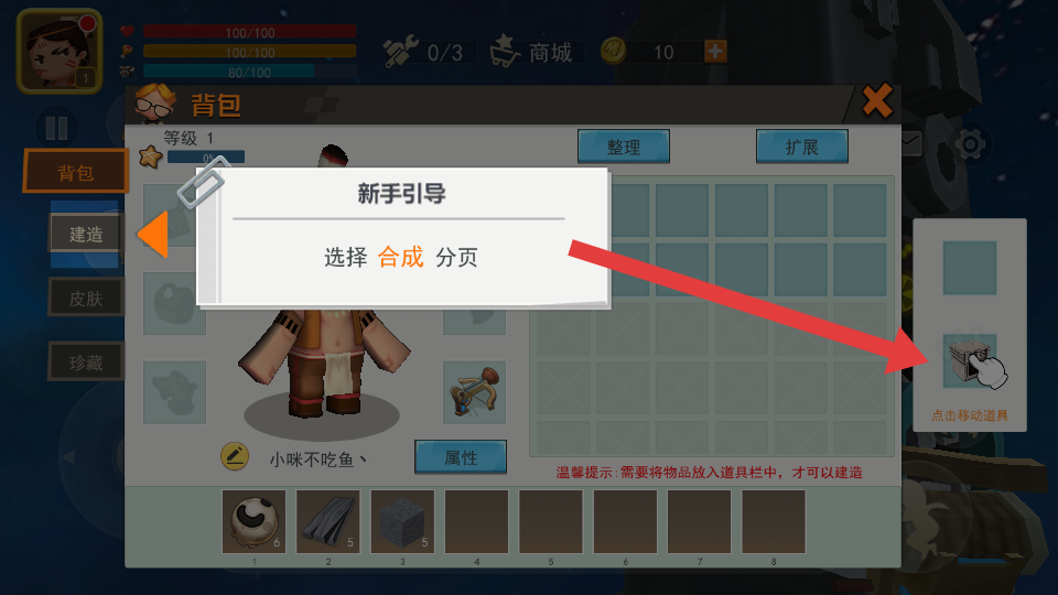 2、打开背包系统,查看初始获得的建造材料,点击材料图标选择使用,再点击场景空白区域即可以放置材料。