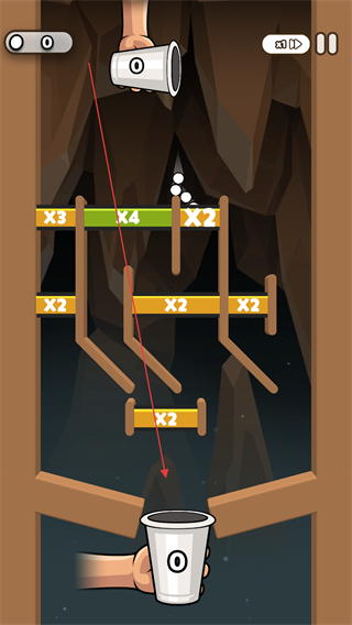 3、操作纸杯引导小球下落,撞击带倍数标识如X3X4的机关,积累增益效果。