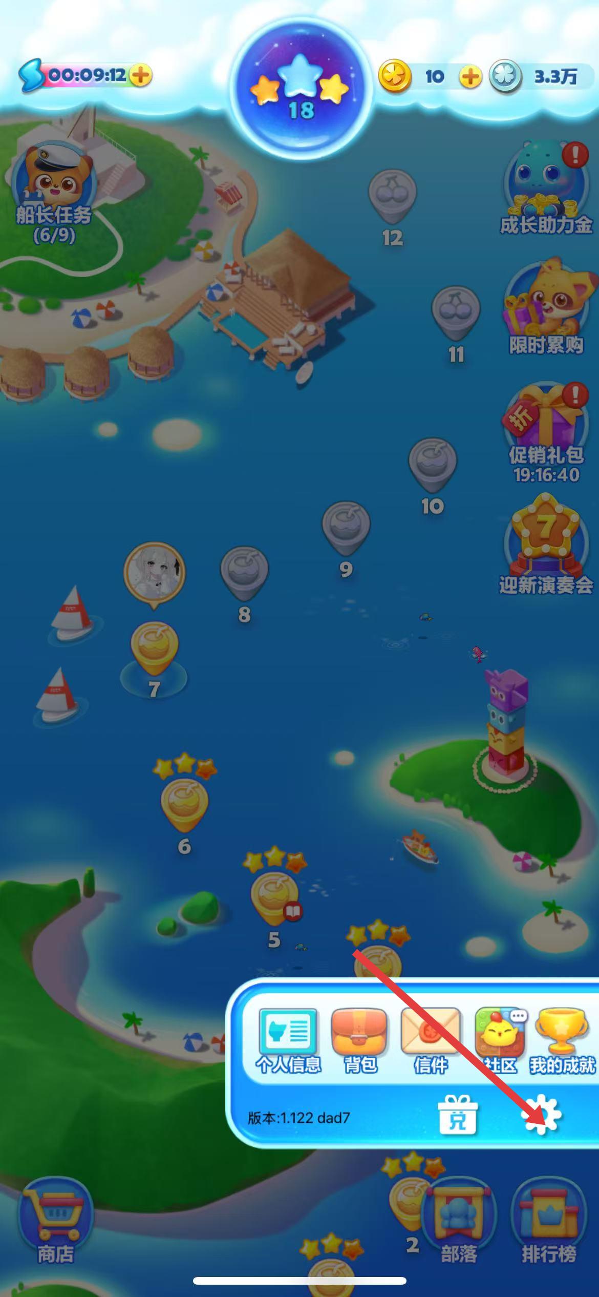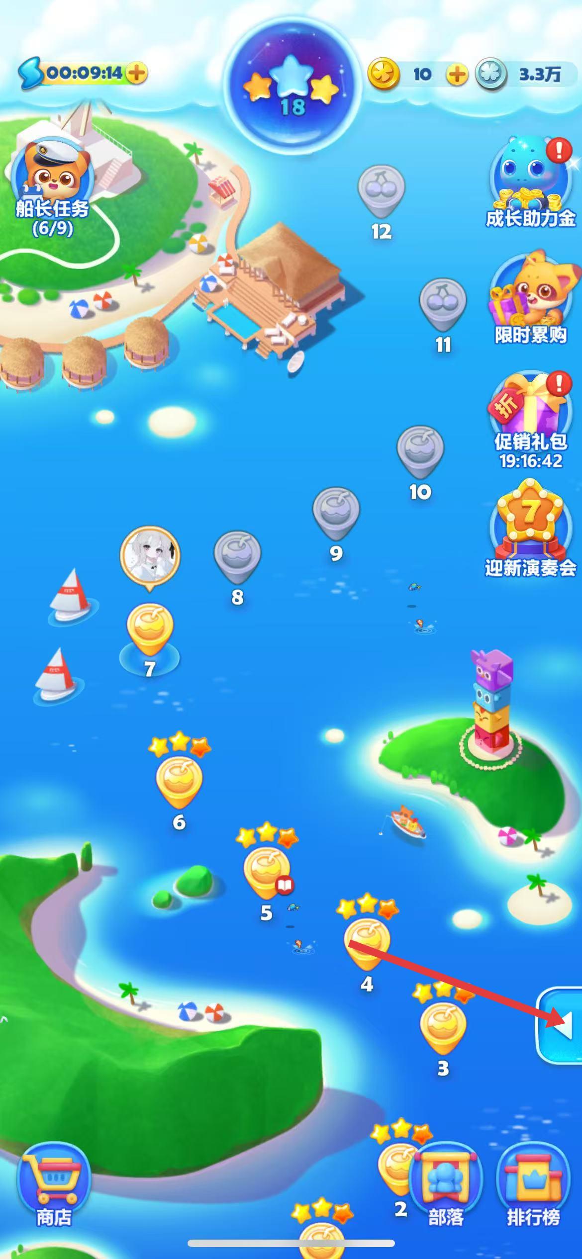 1、打开海滨消消乐游戏,进入游戏主界面,点击小三角标志。