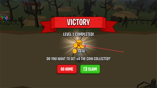 4、战斗胜利显示VICTORY,获得x616金币,可选择GOHOME或CLAIM4倍金币。