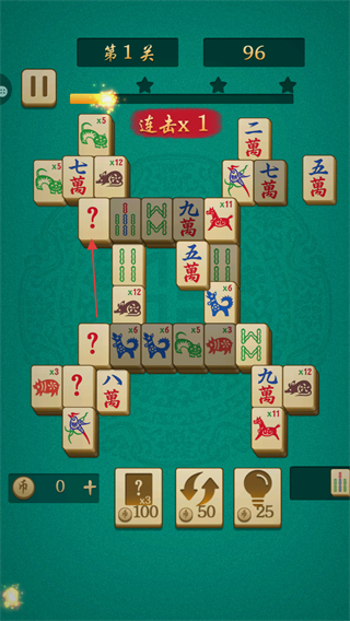 2、持续消除相同麻将牌,触发连击x1,提升分数至96,推进关卡进度。