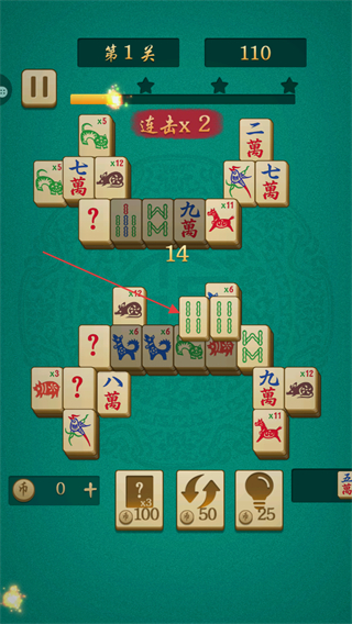 3、继续消除相同牌,触发连击x2,分数升至110,靠近通关条件。