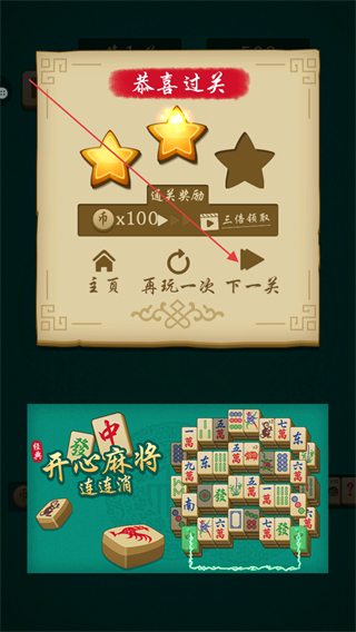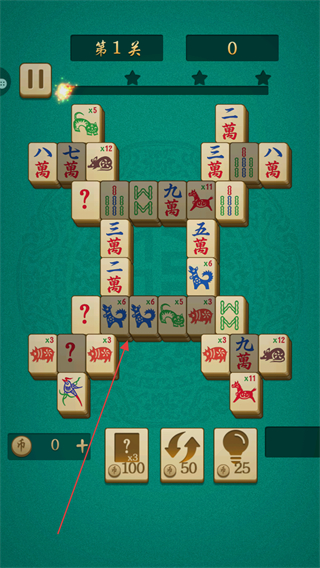 1、在第1关中,找到相同的麻将牌如相同图案的牌,点击消除,积累分数。