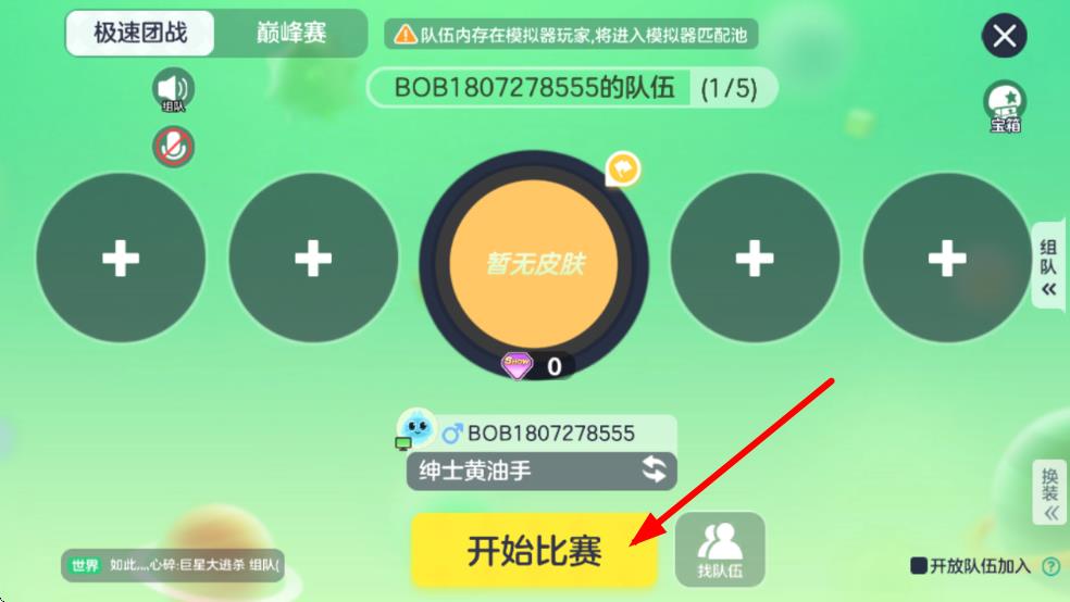 1、进入游戏主界面,点击开始比赛按钮,可选择单人参赛或组队参赛 ,若组队可点“+号邀请好友。