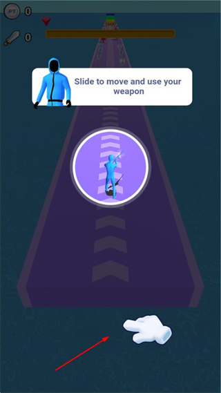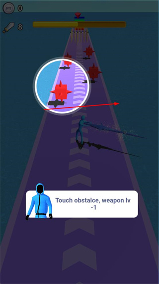 2、避开红色障碍物,若触碰会导致武器等级降低,需专注操控角色避开障碍以维持武器等级。