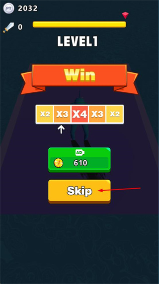 4、完成关卡后,点击黄色Skip按钮,跳过奖励界面,结束当前关卡流程并进入后续环节。