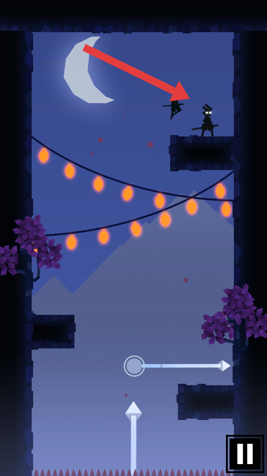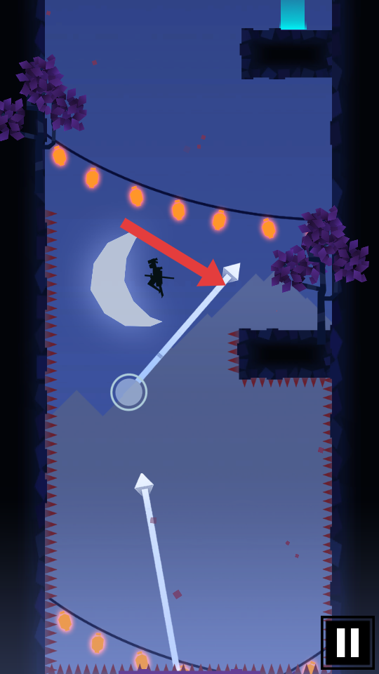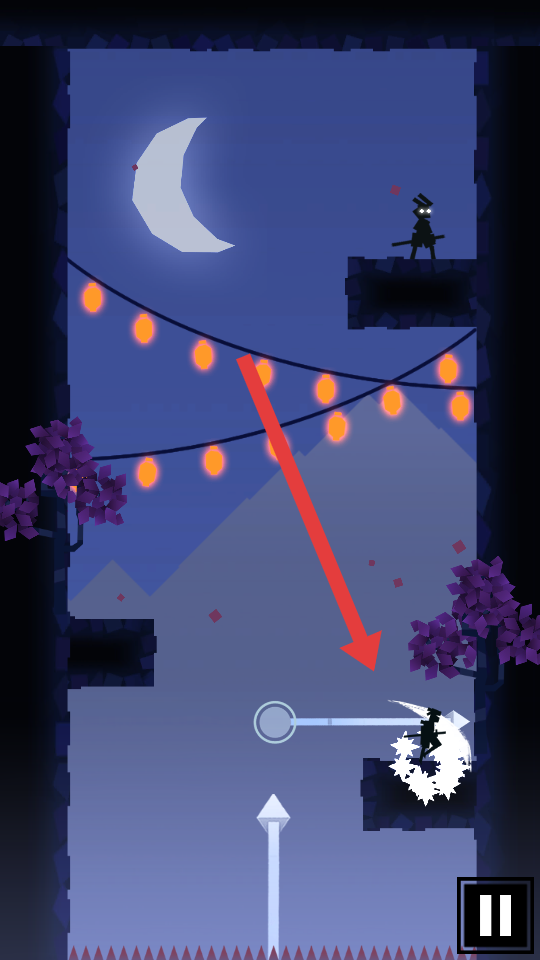 1、基础跳跃与瞄准操作:按住屏幕拖动手指确定跳跃方向与力度,释放手指后忍者跃起,跳至墙面或地面会自动粘住,需要瞄准无钉子的区域,避免触发了危险。