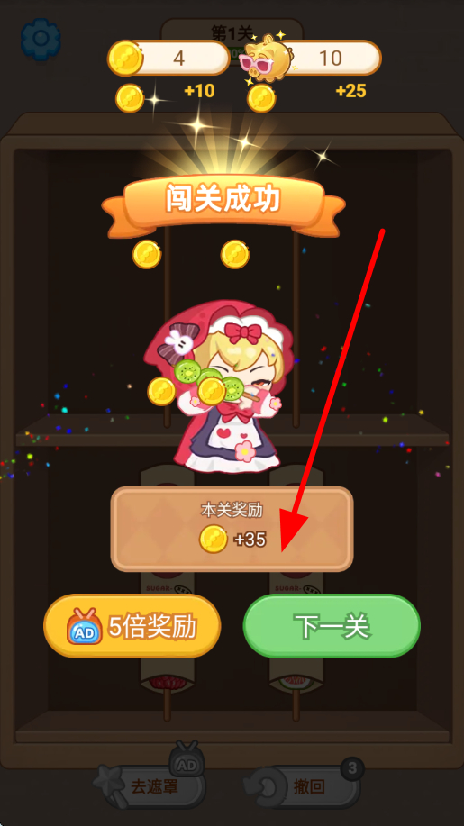 3、当成功完成一关的糖葫芦串制作后,会显示闯关成功,同时获得相应奖励,此时可点击下一关,继续挑战更有难度的关卡,体验不同的制作任务。
