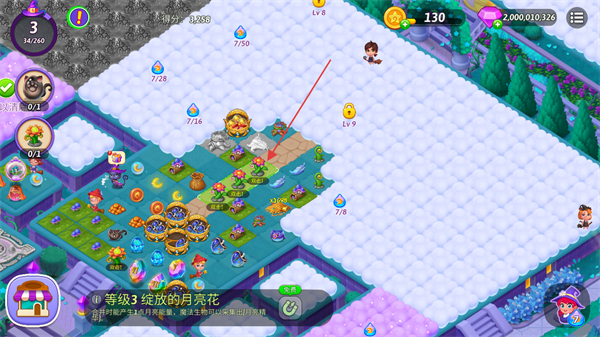 2、合并成长的魔法菇田,使其升级,产生资源,推进任务。