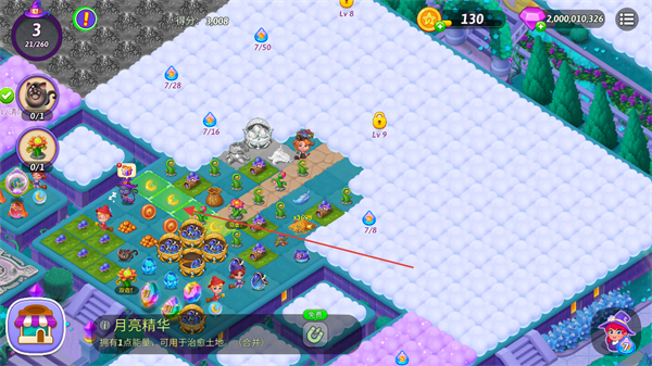 3、收集月亮露珠,用于治愈土地,拓展操作区域,为合并元素做准备。
