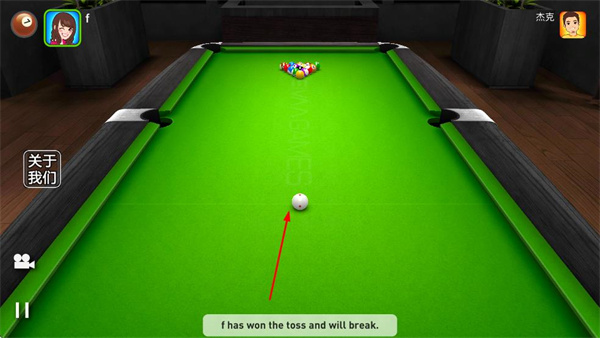 4、进入台球对局界面,根据提示操控白球,开始进行击球操作。