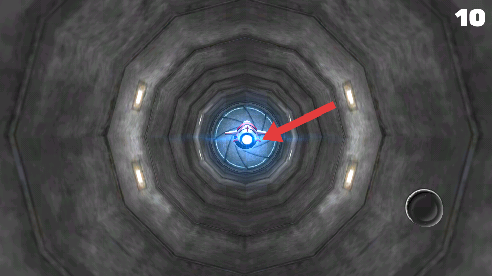 1、操控飞机在六边形隧道中飞行,瞄准中心的蓝色光圈区域,保持飞行方向,顺利通过隧道,同时留意右上角的分数变化。