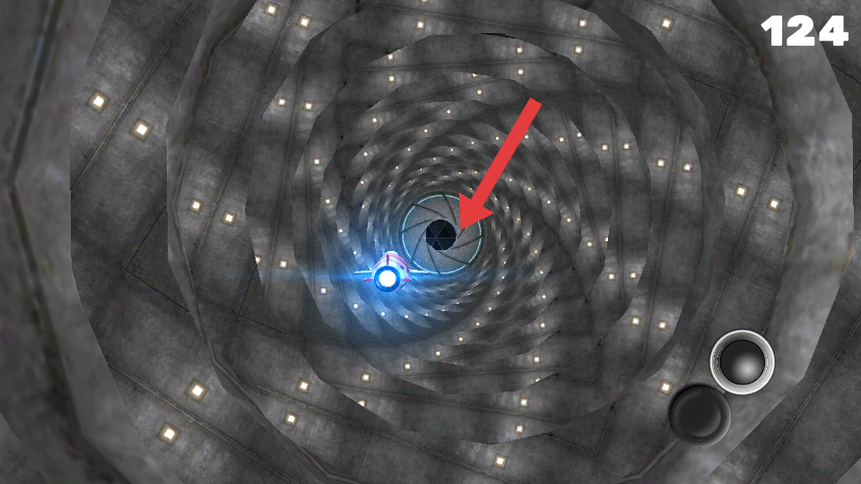 2、在螺旋隧道场景中,继续瞄准中心的黑色洞口区域,调整飞机飞行轨迹,避免碰撞隧道壁,持续积累分数如124分。