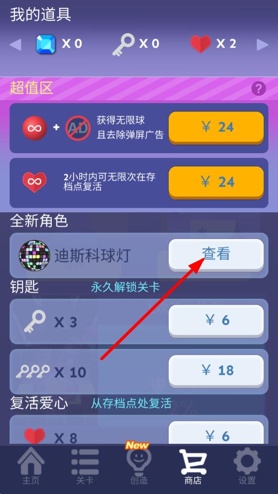 1、打开滚动的天空,点击底部商店,找到新球点击查看。