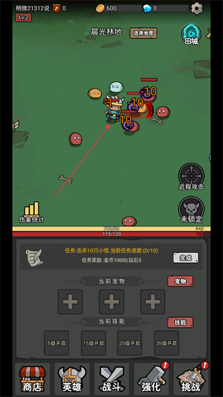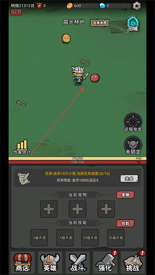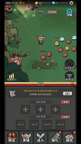 1、在晨林地操控英雄移动,靠近怪物触发战斗,通过点击进行攻击。