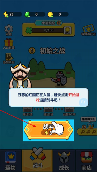 1、点击屏幕下方黄色战斗按钮,触发初始之战剧情,提示丑恶红国入侵,准备迎接战斗。