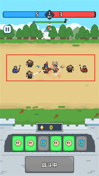 4、进入战斗界面,下方展示已获卡牌,士兵自动攻击敌人,上方显示双方兵力和战斗次数。