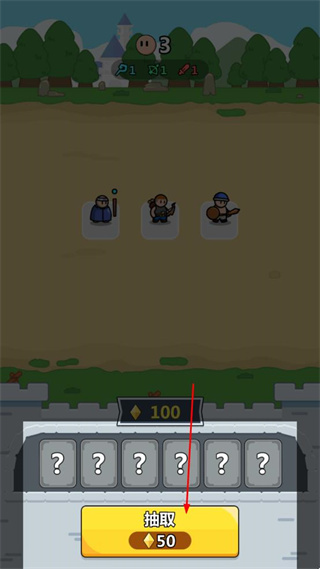 2、进入战斗准备界面,消耗50钻石点击抽取按钮,从六个问号卡片中获取战斗卡牌。